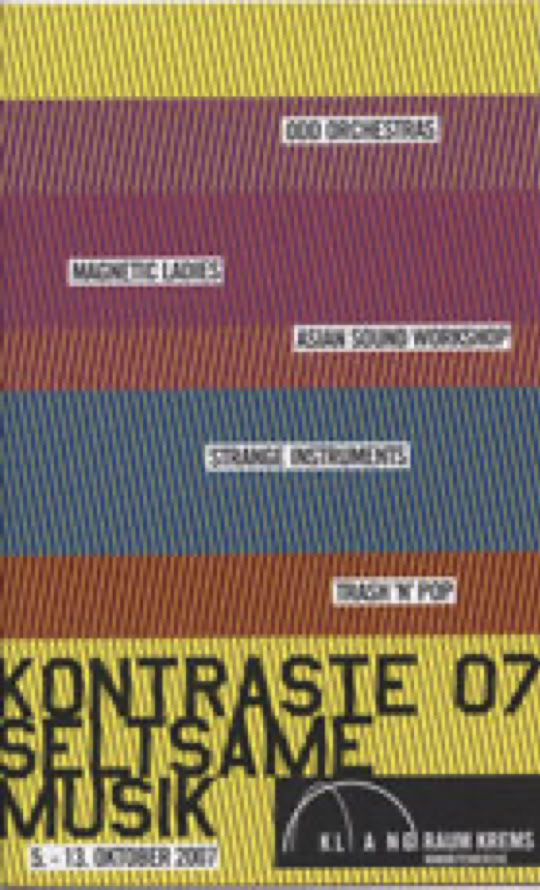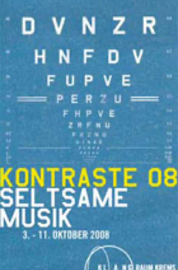 Unter dem Titel KONTRASTE - SELTSAME MUSIK bietet der Klangraum Krems jedes Jahr im Herbst ein kleines, feines Musikfestival, das jenseits aller Mainstreams und modischer Trends spezifische musikalische Themen, Gattungen und Strömungen exemplarisch aufgreift. Die Maximen des Programms - Entdeckungsfreude, programmatische Vielfalt, ein offener Blickwechsel, Gegensätze, Überraschungsmomente, Humor, Bewegung gegen den Strom - sind durchaus als Herausforderungen an neugieriege Hörerinnen und Hörer zu verstehen.