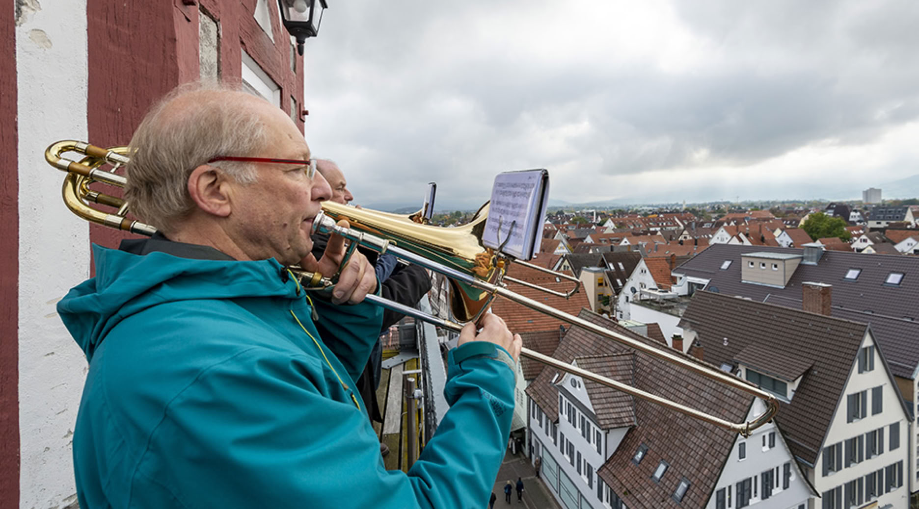 Seit fast 500 Jahren steigen jeden Samstag um halb 12 auf den Kirchheimer Rathausturm und schmettern ihre Choräle in alle vier Himmelsrichtungen. Der Komponist und Musiker Ronald Deppe knüpfte an diese Tradition an und bricht sie gleichzeitig mit einem neuen Stück für Bläserquartett auf.