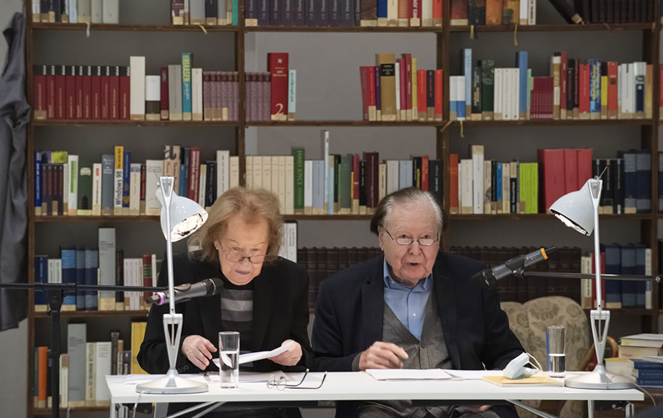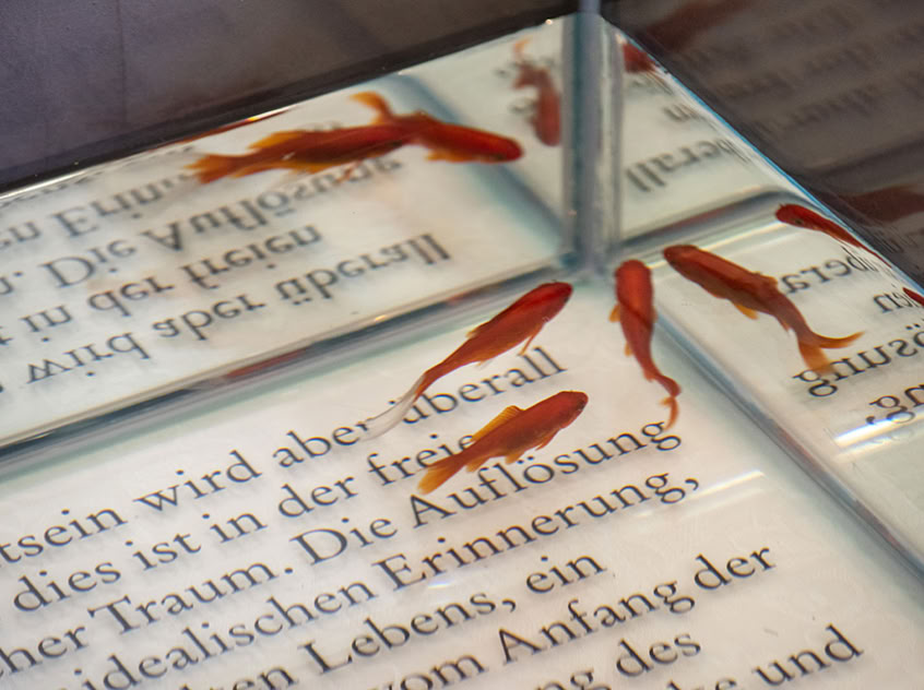 Die Bildhauerin Felicitas Franck verwandelte den Ausstellungsort in die Anmutung einer Höhle – mit Höhlenkunst an dunklen Wänden. Ihre Installation „Hölderlin lesen unter Fischen“ würdigt den vollendeten Rückzug des Dichters. Für die Sprachwissenschaftlerin Dorothea Franck ist die Sprache der Ort des Rückzugs par excellence. Sie spürt grundlegenden Polaritäten in der Spräche nach, wie der zwischen analog und digital. In ihren Texten untersucht sie was passiert, wenn Wörter freien Auslauf haben: fest wird flüssig, Bedeutungen wackeln, kippen und zerfließen, die Sinne werden vor dem Verstand bedient. Verfremdung heilt Entfremdung.