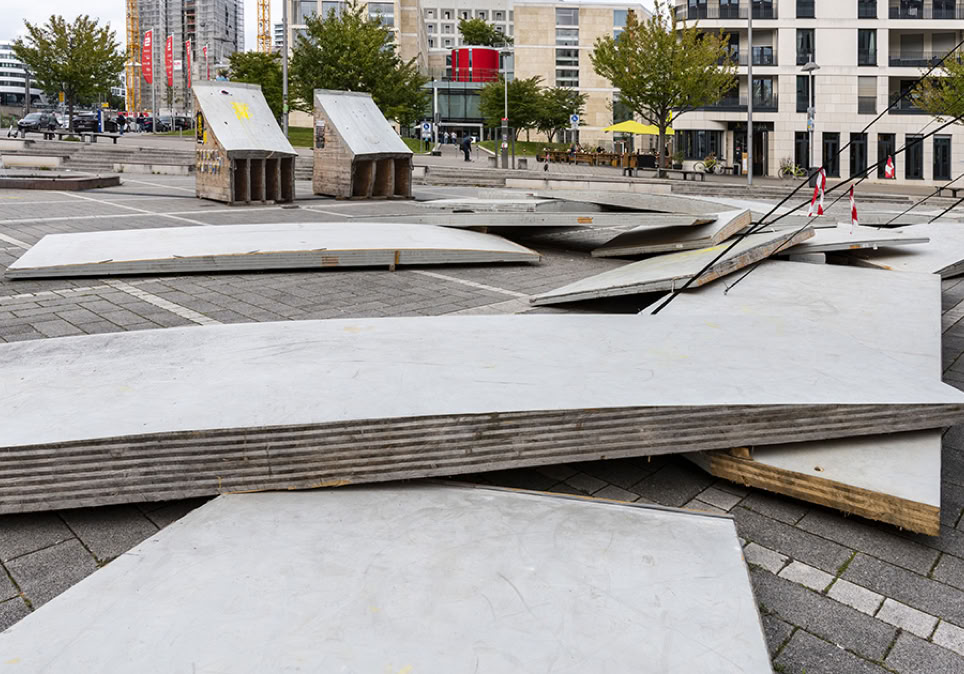 Das Festivalzentrum diente an zentraler Stelle der Stadt als offener Treffpunkt und Ort der Begegnung, aber auch als Rückzugsraum mitten im öffentlichen Leben der Stadt. Entworfen vom Architekturstudio „umschichten“, bestand es aus den Schalungsplatten der Kelchstützen des umstrittenen Bahnprojekts Stuttgart 21. Die begehbare Skulptur verweist auf eine Schollenlandschaft, deren massive Elemente Publikum und Passanten einluden Platz zu nehmen. Zugleich war die Installation Informationsträger für die Projekte in der gesamten Region.
