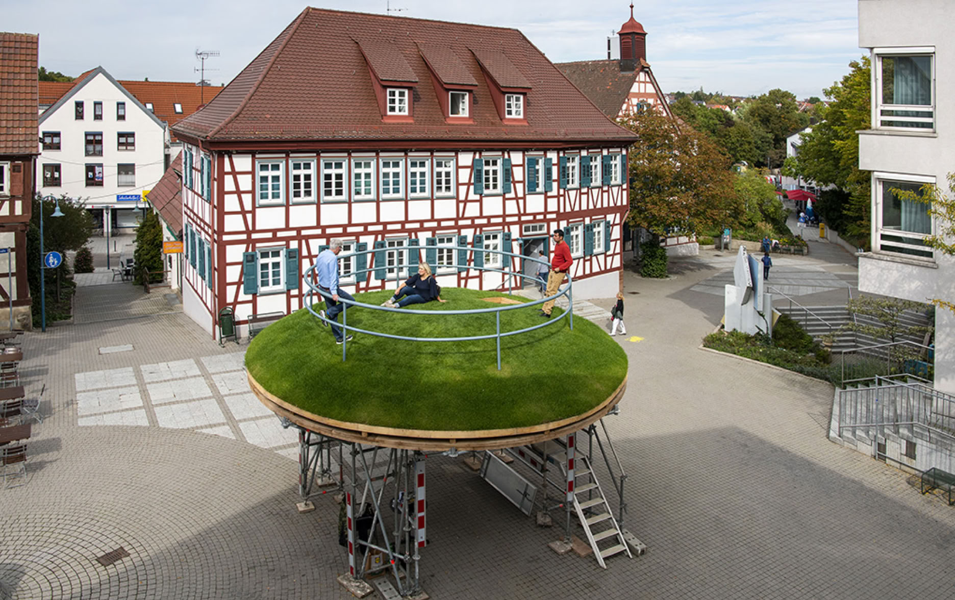 Eine kleine grüne Insel schwebte über dem Ditzinger Rathausplatz. Auf einem kreisrunden Podest erhob sich drei Meter über dem Boden ein künstlicher Rollrasen-Hügel und war frei begehbar.