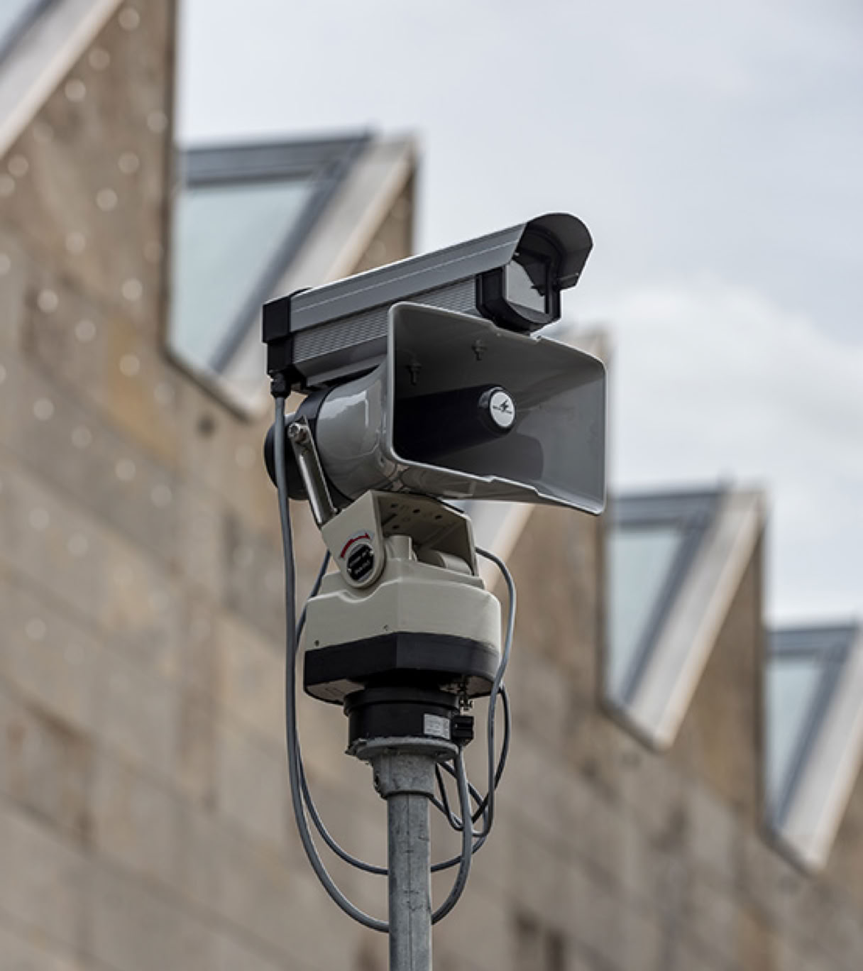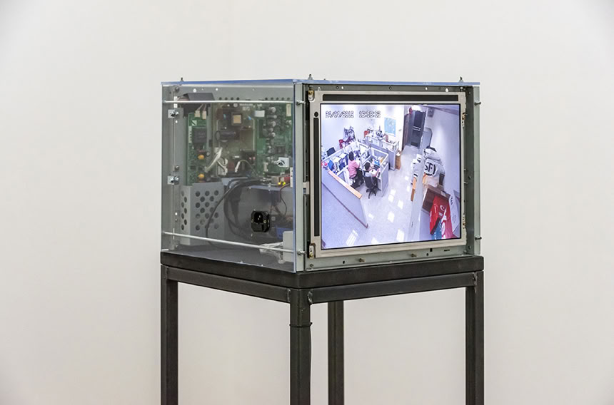 Eine Überwachungskamera, montiert an einem über zwei Meter hohen Mast, zeichnet auf, was in der näheren Umgebung passiert. Über Lautsprecher teilt die Kamera den Passanten mit, was sie wahrnimmt. Depoorter personalisiert das gerät, indem er die Technik aus der Ich-Perspektive berichten lässt.