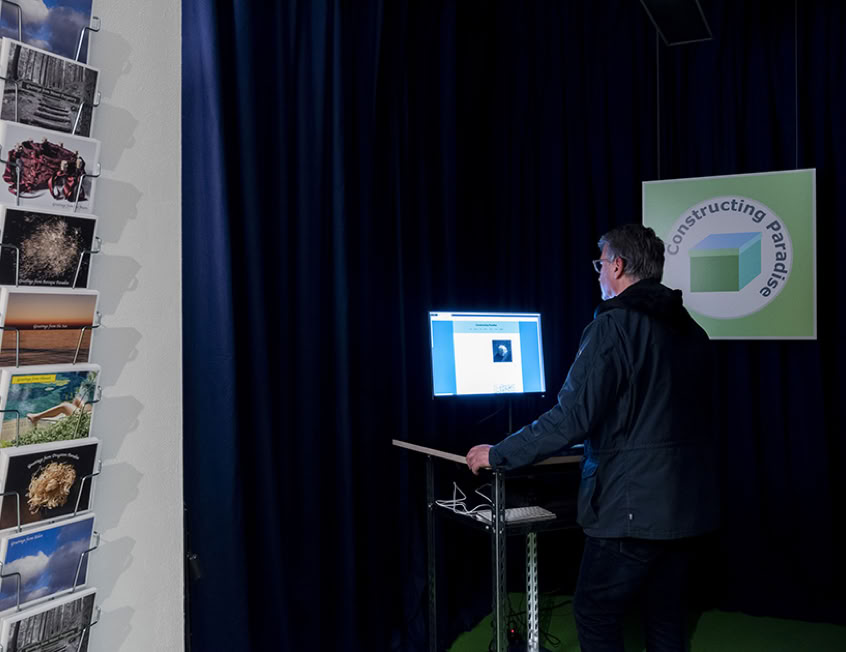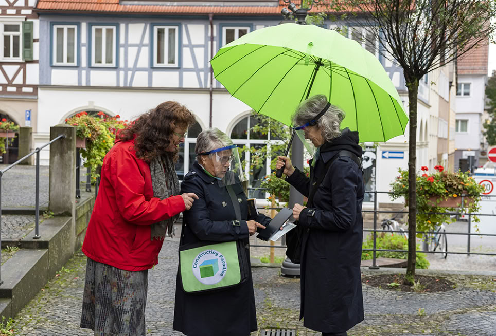 Die Künstlerin nahm mit dem Paradies den Rückzugsort par excellence in den Blick. Sie entwickelte sieben unterschiedliche paradiesische Vorstellungen und leitete einfache Bauanleitungen aus ihnen ab: vom Garten Eden, über das Moon-Paradies bis zum Drugstore, dem Ort des Rausches und der Stimulation. Zwei beauftragte Paradies-Fachpersonen erläuterten Interessierten in der Schorndorfer Innenstadt die Konzepte und erklärten, wie sich diese in den eigenen vier Wänden umsetzen ließen.