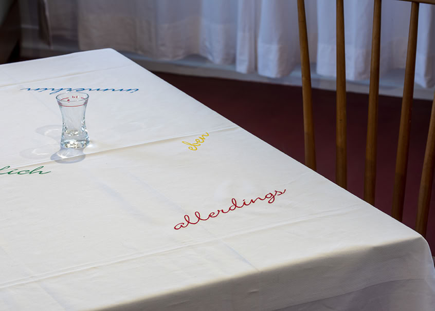 Eine sprachexperimentelle Performance nannte die Künstlerin ihre raumgreifende Installation. Über zehn Tage hinweg bot sie einen „poetischen Service“ an, wobei sie die Marbacher Bevölkerung aufrief, Schriftstücke oder Gegenstände vorbeizubringen. Die überlassenen Materialien wurden zerlegt und bearbeitet, Maurer legte im buchstäblichen Sinne Hand an, grub sich unter die Oberfläche dieser Texte und Dinge, durchlöcherte Worte, zerschnitt Tische sezierte Zollstöcke, zerschlug Buchstaben und Ziffern… Es entstanden Gebilde, deren Funktion nicht mehr im Zweckmäßigen sondern im Poetischen lag.