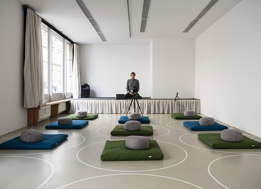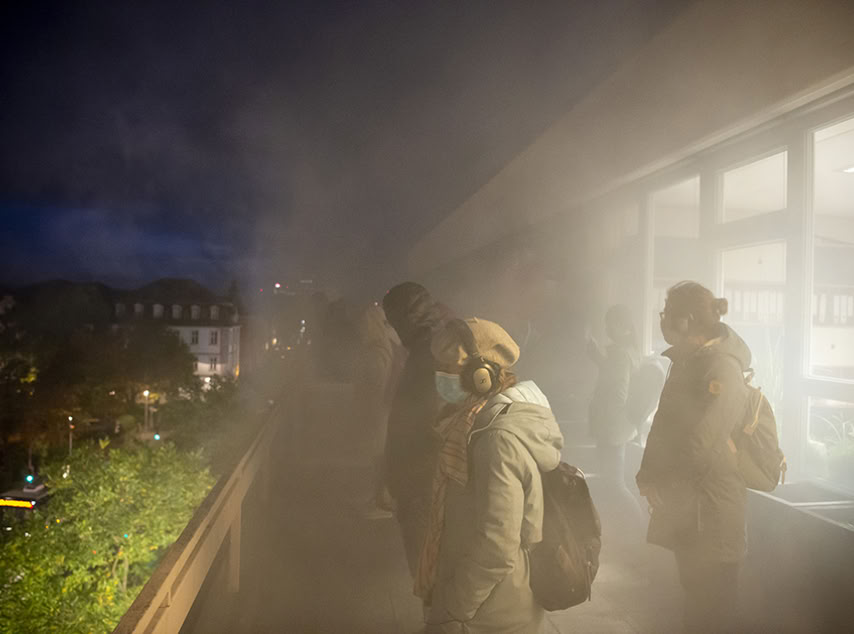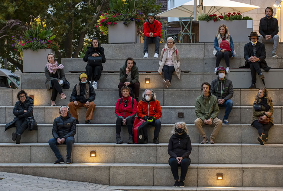 Eine mit Kopfhörern ausgestattete Gruppe brach gemeinsam auf zu einem ungewöhnlichen Rundgang durch die Stadt. Eine künstliche Stimme, wie man sie von Navigationssystemen kennt, leitete die Gruppe. Mit jedem Schritt wird die Computerstimme vertrauter. Doch wer spricht da und wem folgen wir, wenn wir uns leiten lassen? Wie beeinflusst künstliche Intelligenz die Wahrnehmung, und wie wirkt sich die Fernsteuerung auf des Verhalten der Gruppe aus?