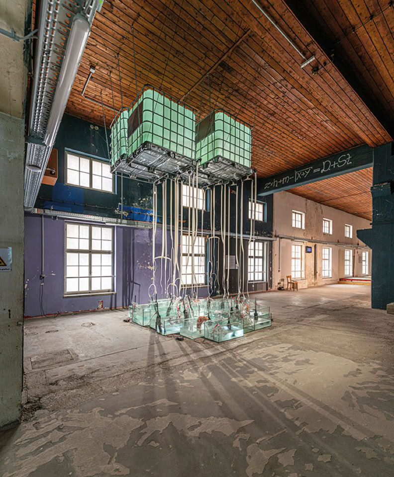 Christine Biehler (DE): persalem, 2024, 5x5x5m, IBC-Container, Glasbecken, Schläuche, Tropfsystem, Metallelektroden, Grafit, Aktivkohle, Stromleitungen, Akkumulator, Pumpe, Orgelpfeife