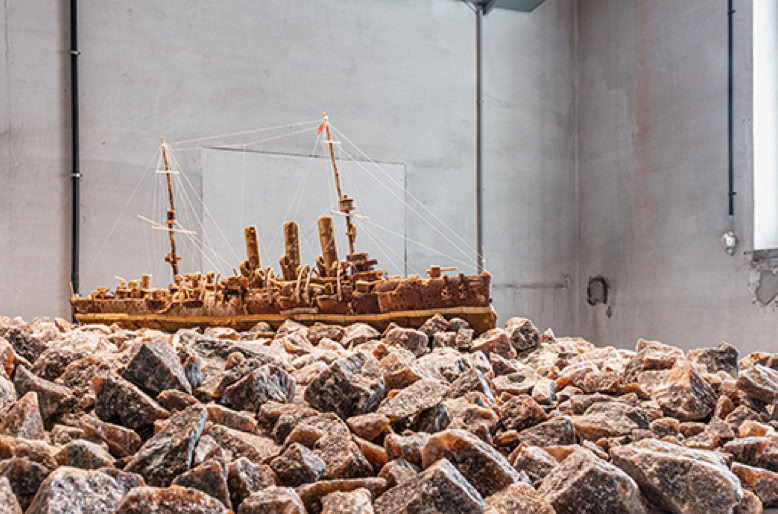Norbert W. Hinterberger (AT): Schwere See, Modell der Aurora 1:100, Brot auf Salzsteinen