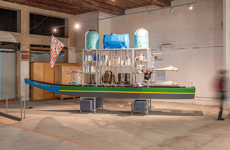 Lucy + Jorge Orta (F): Orta Water Plätte, 2023, Stahlkonstruktion, Wasserfiltereinheit, Biwaks, Glaskaraffen, Wasserfässer, Kanister, verschiedene Objekte, Holzflaschen. Plätte vom Schiffleut Museum Stadt-Paura