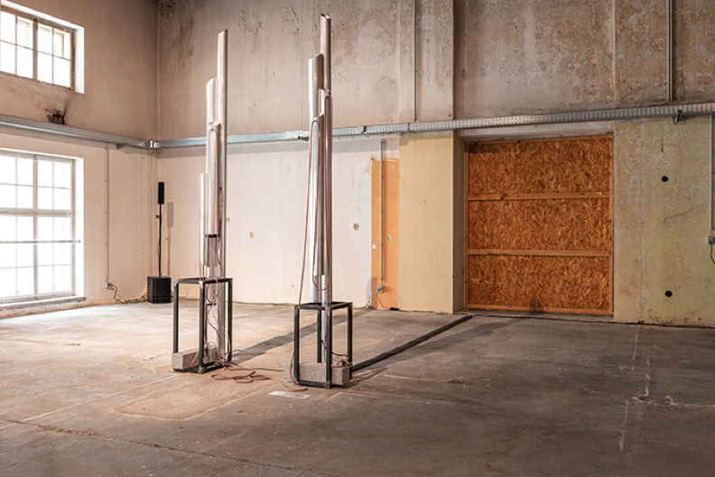 Caterina Gobbi (IT): Monuments t a melting Voice, 2023/2024, Klanginstallation, Aluminium, Verstärker, Tonerreger, Kletterseile