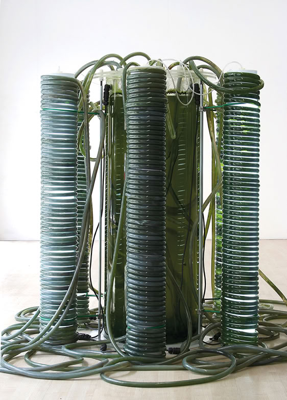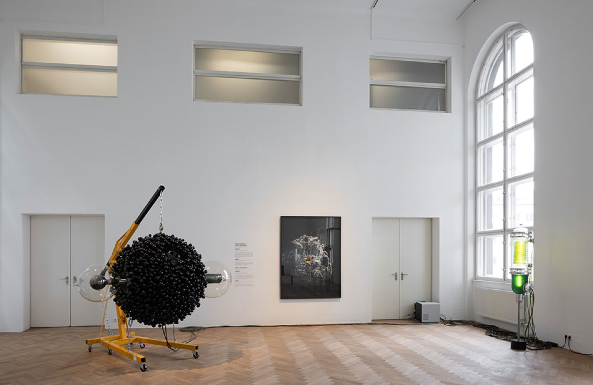 Thomas Feuerstein (AT): Futur II (Time Machine I), 2013, Stahl, Glas, Kunststoff, Grünalgen. Osmose, 2019, Zeichnung mit aus Grünalgen gewonnener Kohle auf Papier. Foto: Florian Voggeneder