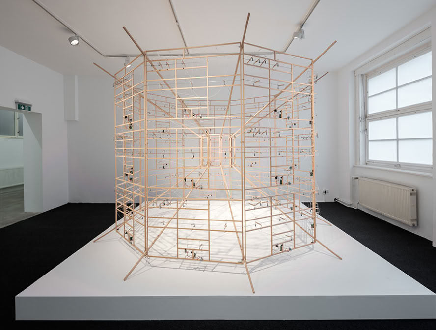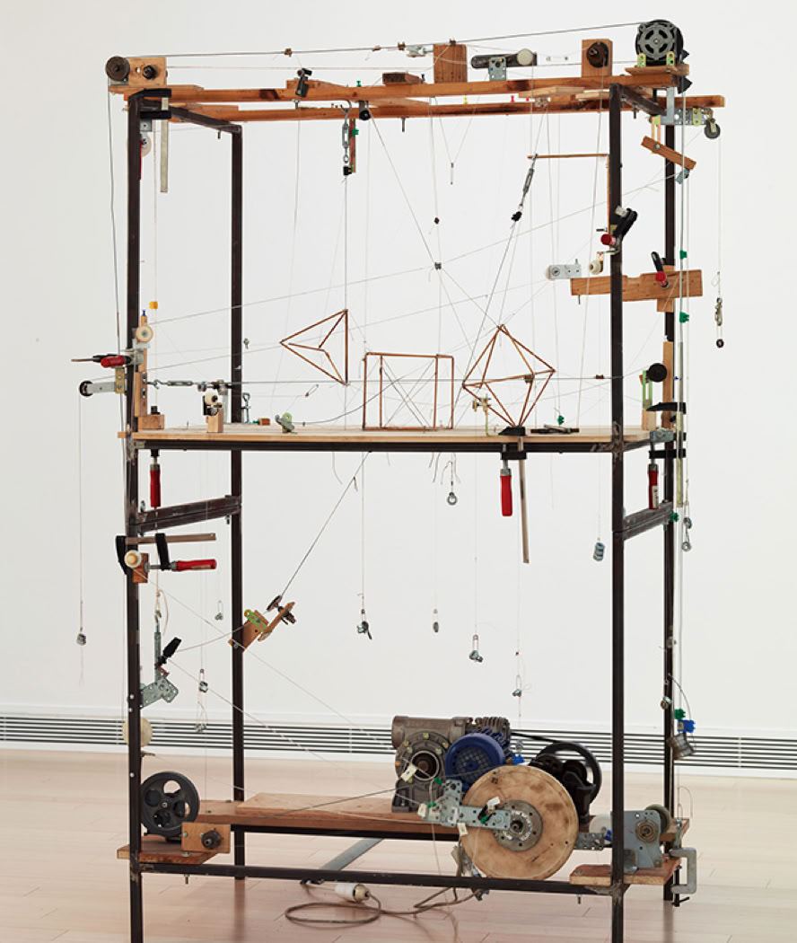 Attila Ssörgö (HU): Untitled (1 tetrahedron + 1 cube + 1 octahedron = 1 icosahedron), 1999, Holz, Faden, Spinnrad, Anlage aus Draht, Elektromotor. Foto: Galerie Gregor Podnar