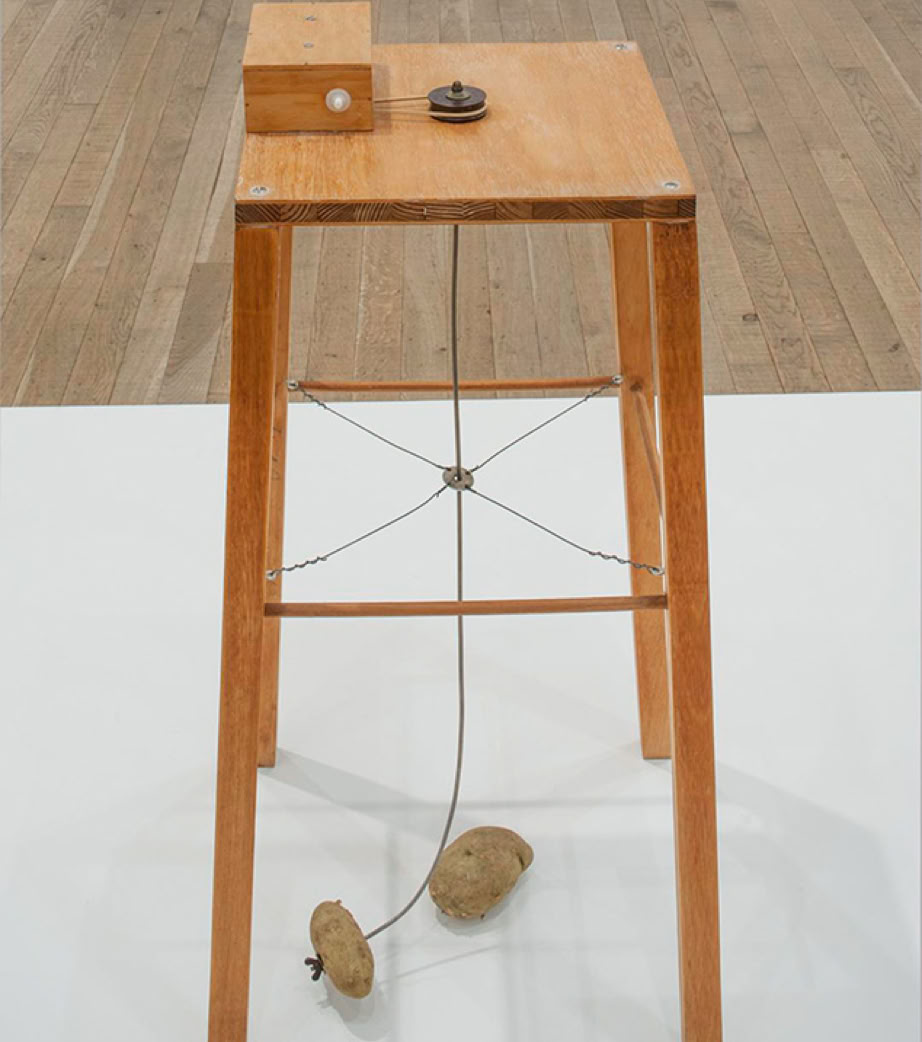 Sigmar Polke (DE): Apparat, mit dem eine Kartoffel eine andere umkreisen kann, 1969, Holz, Draht, Elektromotor, 2 Kartoffel. Foto: ZKM Karlsruhe
